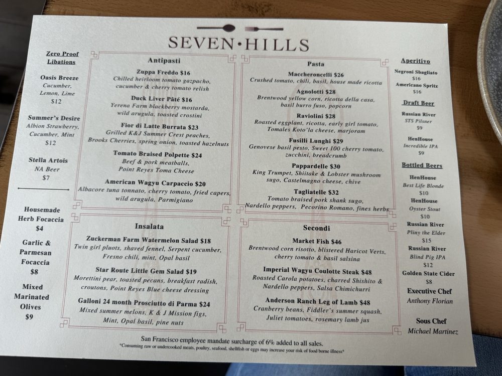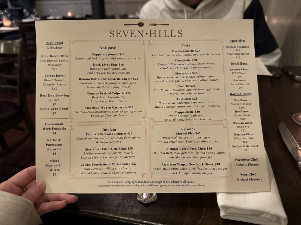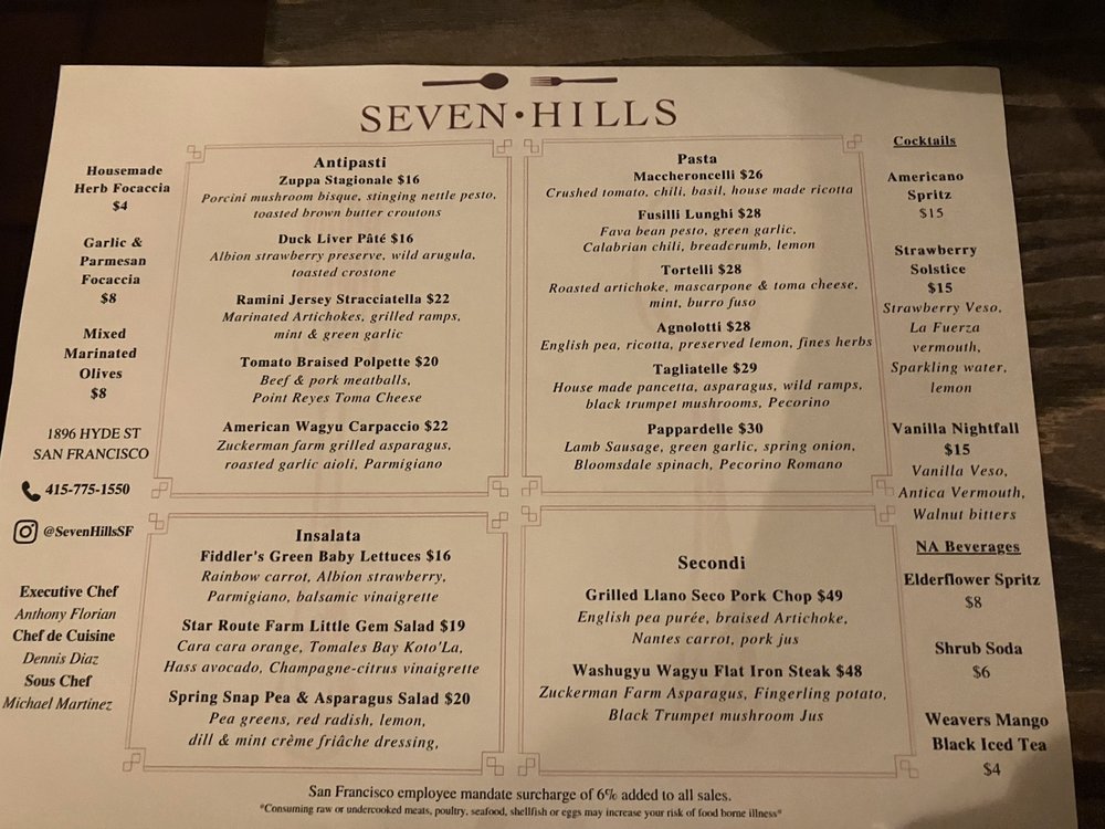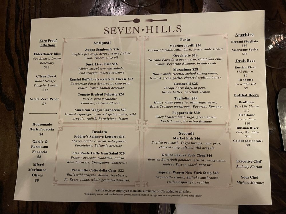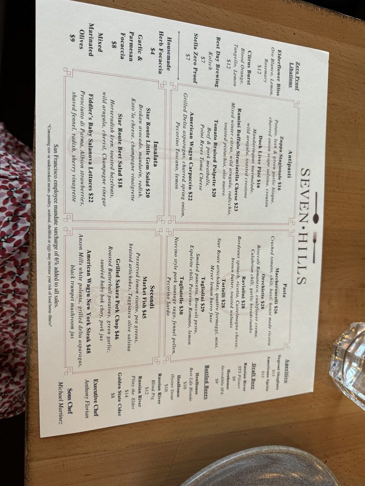 Seven Hills, located in San Francisco, offers a variety of Italian-inspired dishes in a cozy and intimate setting. The menu features seasonal options, such as the Zuppa Stagionale and Fiddler's Green Prosciutto di Parma Salad. Their house-made focaccia and pasta dishes, like the Maccheroncelli and Agnolotti, are highly recommended by customers. The ambiance is described as romantic and perfect for a date night or dinner with friends. The attentive and friendly staff enhance the dining experience, making Seven Hills a must-visit for those craving authentic Italian flavors. The restaurant also caters to dietary preferences with pescatarian and vegetarian options available. With its welcoming atmosphere and delicious food, Seven Hills stands out as a top choice for Italian cuisine in the San Francisco area.