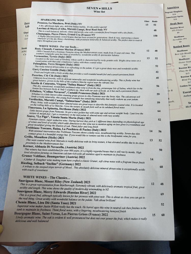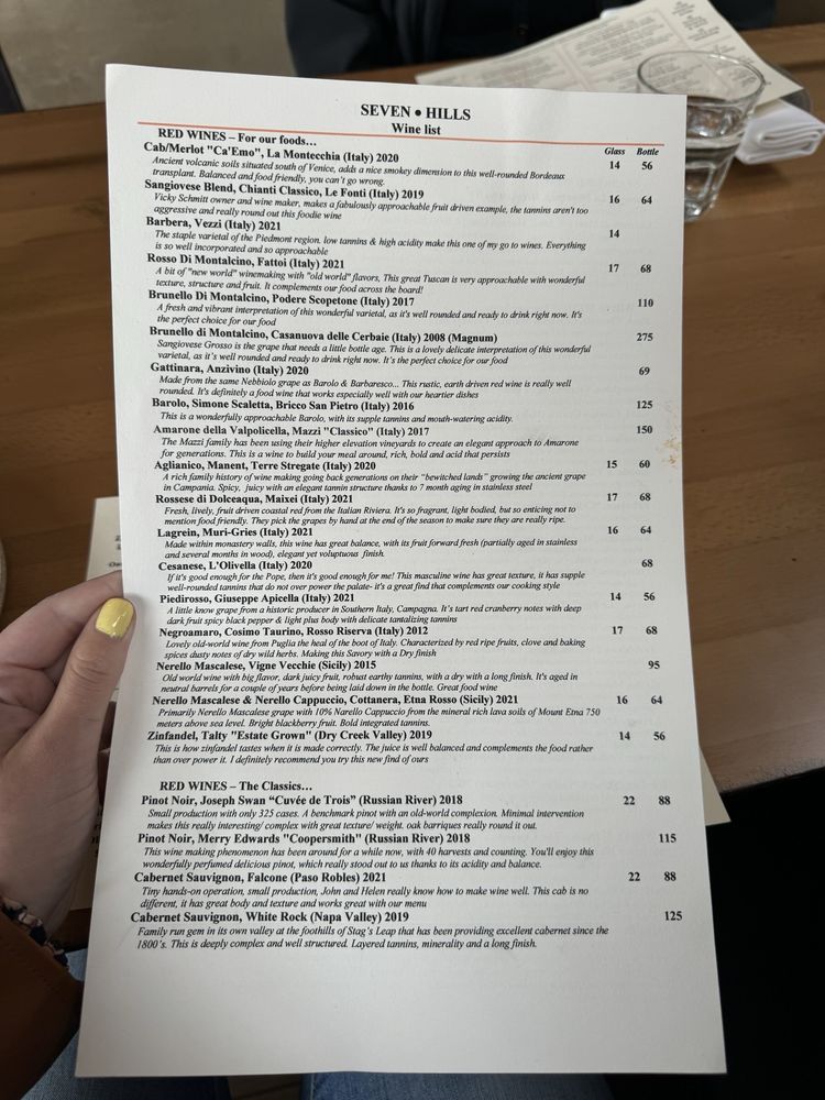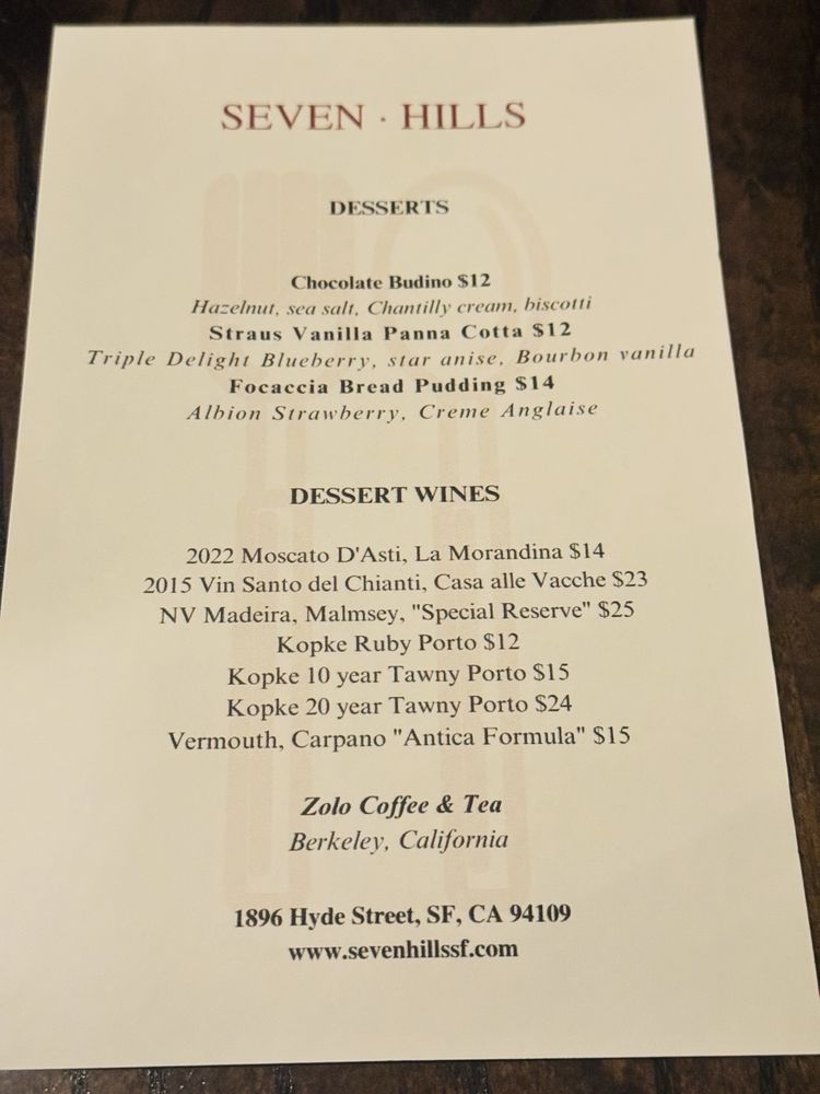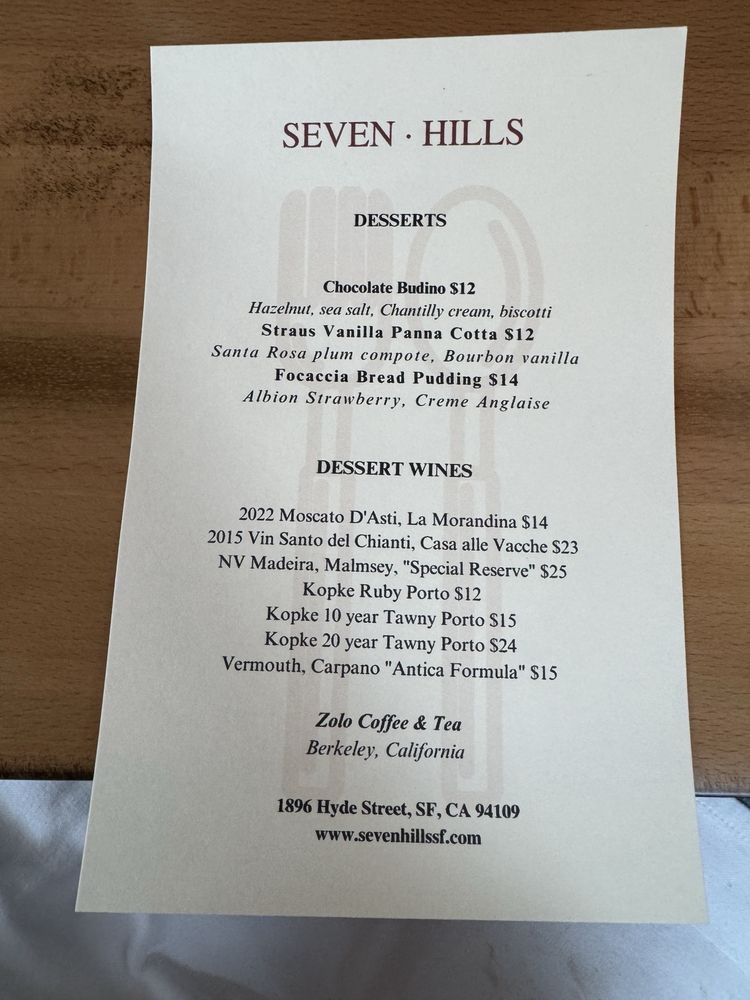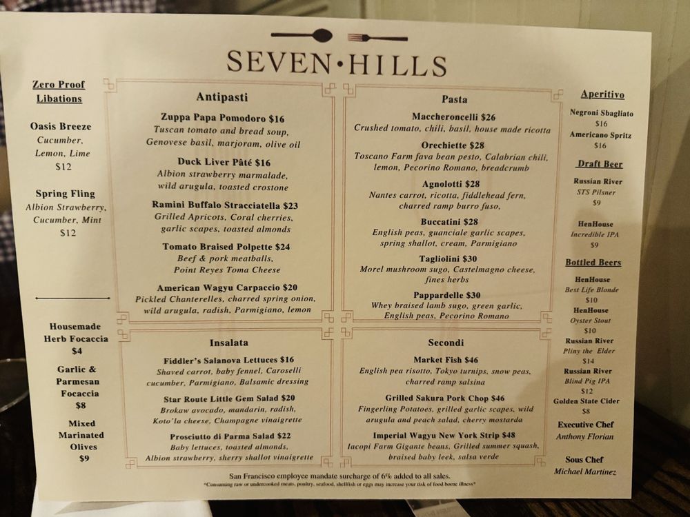 Seven Hills, located in San Francisco, offers a variety of Italian-inspired dishes in a cozy and intimate setting. The menu features seasonal options, such as the Zuppa Stagionale and Fiddler's Green Prosciutto di Parma Salad. Their house-made focaccia and pasta dishes, like the Maccheroncelli and Agnolotti, are highly recommended by customers. The ambiance is described as romantic and perfect for a date night or dinner with friends. The attentive and friendly staff enhance the dining experience, making Seven Hills a must-visit for those craving authentic Italian flavors. The restaurant also caters to dietary preferences with pescatarian and vegetarian options available. With its welcoming atmosphere and delicious food, Seven Hills stands out as a top choice for Italian cuisine in the San Francisco area.